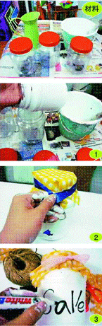 2.待乾後,格子布料剪一小塊正方形,蓋在塑膠罐上,然後將緞帶綁上,做好裝飾。