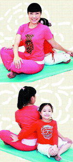 1.親子兩人背對背,盤腿坐姿準備,兩手輕鬆地放在自己膝蓋上。