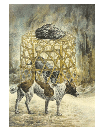 籠子上重壓一塊石頭,使竹籠裡的小黑狗愈被困住無法脫離;背景的土坡,用細膩短皴擦上淺灰石青色,統一畫面中、遠景與竹籠之間的距離,並讓土坡與竹籠緊臨,產生狹隘的空間感。