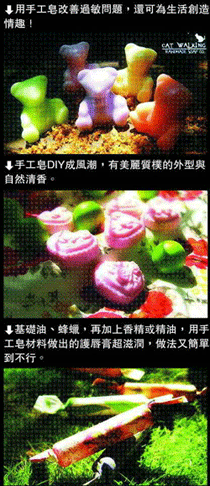 投入手工皂DIY的倪惠說,除了它美麗質樸的外型與自然清香外,其實是因為香皂的成分可隨個人體質或偏好量身訂作,加入精油、天然花草蔬果,調配屬於自己的配方,不需擔心市售香皂可能加入的防腐劑、螢光劑等化學物質;此外,手工皂可在水中自然分解,不會造成污染。手工皂DIY不但可自己掌控製作成本,又能為健康把關,更可為地球盡心力。