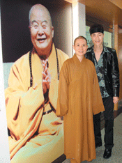 任職電視台的北京人劉璐(右),刻意在心中偶像星雲大師的法相旁,與金光明寺住持妙蓮法師留影。圖/劉璐提供
