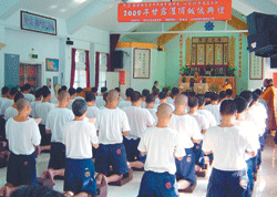這是慈悲基金會二○○六年以來,在監所舉辦的第五十三場皈依典禮,台南監獄典獄長方子傑、分監長賴政榮,國際佛光會中華總會副總會長陳順章及檀講師趙淑鏗等人觀禮。