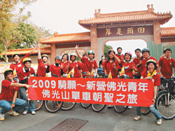 十位新營佛光青年二十一日從新營出發,路過善化慧慈寺、台南安平樹屋、南台別院、岡山禪淨中心等四個中繼站,全程一百一十七公里。一路上參訪寺院,沿途匯聚志同道合的夥伴同行,到達佛光山時,已聚集二十人同行,展現佛光人眾緣和諧的性格。