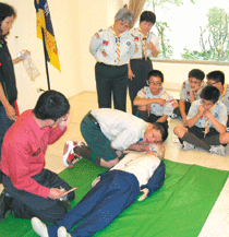 惠中佛光童軍團集會,二十二日邀請台中市消防局南屯分隊員陳信凱老師指導童軍急救方法,童軍和家長近八十人實地操練,學習CPR急救課。