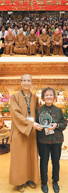 並表揚優秀義工,榮獲榮譽義工的呂少英(下圖)表示,她對獲獎感到意外,感恩常住的愛護,其實能有健康的身體為常住服務,跟大眾一起工作,已很開心。