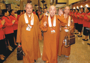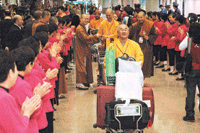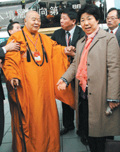 歡喜接機 500義工好「唱」快 記者李祖翔 |2009.03.31 語音朗讀 628觀看次 字級 大 中 小 星雲大師迎接張連珍(右),對於佛教論壇在台北舉行,共祝會議圓滿。記者邱麗玥攝【記者李祖翔台北報導】「歡迎,歡迎,You be happy,We will happy,大家都歡喜。」參加第二屆世界佛教論壇台灣分論壇的海外貴賓,昨天陸續抵達桃園國際機場,國際佛光會中華總會動員桃、竹區義工,自上午十一時到最後一班航機降落,歡迎歌聲未曾停歇,讓貴賓笑得合不攏嘴,直說:「好歡喜!」為了迎接世界各地的海外貴賓到台灣,中華總會桃、竹區講堂的知賓和金剛護法,共五百位義工穿著粉紅色外套、旗袍和黃色背心,從上午九時就在機場集合守候,排練隊型,帶領的法師父突發奇想唱起歡迎歌,要貴賓一入境就心生歡喜;義工就定位後需要連站六個鐘頭,不停地微笑唱歌,雖然辛苦卻一位比一位開心。(記者邱麗玥攝)貴賓一下機被歌聲和笑靨迎接,還拿到一支巧克力花,大陸來的高齡法師當場童心大起,用巧克力花玩起遊戲,他們笑說:「感覺大家都是一家人,真好啊。」也有學者用不純正的中文跟著哼:「歡迎,我們歡迎你。」在班機輪替的空檔,一些知賓和護法生怕貴賓入境,沒人用歌聲歡迎,不敢去吃飯,只用巧克力果腹。(記者邱麗玥攝)佛光山開山星雲大師出現時,義工更振奮,洪亮地喊著:「大師好。」大師也高舉蓮花指回應,大師所到之處都是一陣歡笑聲。 前一篇文章 世界論壇登台 星雲大師迎賓 下一篇文章 巧!依空法師與兩空姐2度結緣 熱門新聞 01響應零飢餓 日光寺廣贈公益米2025.10.1002佛光山大明寺、宏法社 獲頒苗栗縣績優宗教團體2025.10.1003【走讀城鄉】 多元藝術大師楊英風及其美術館2025.10.1004香港佛光緣美術館 唐代宮廷服飾復原展2025.10.1005輝達進駐北士科 可專案設定地上權 2025.10.1006星雲大師全集【講演集】佛教與青年—佛教青年成功立業之道2-22025.10.1007【生活快門】全台最老郵筒2025.10.1008【美味食光】交換早餐2025.10.1009【人間小品】 歲月的浪淘沙2025.10.1010施莫會2025.10.10 訂閱電子報 台北市 天氣預報 台灣一週天氣預報 相關報導 緬懷星雲大師 全球佛教學者暢談人間佛教245校雲端交流 凝聚三好共識推廣生命教育 林聰明獲特殊貢獻獎西方寺瑜伽課 接引民眾結法緣元宵乞龜 390兩大金龜亮相基督城地震10年 佛光山領眾祈願