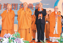 香港佛教聯合會長覺光長老(由左至右)、佛光山開山星雲大師、國際佛光會世界總會副總會長吳伯雄、日本總本山知恩院門跡淨土門主坪井俊映,共同祈願世界和平。記者邱麗玥攝