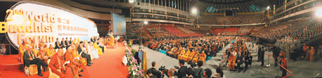 第二屆世界佛教論壇閉幕典禮全景圖,會中,星雲大師除宣讀論壇宣言,逾五十國、千位佛教僧侶、學者、三萬名信眾齊聚台北小巨蛋,共同祈願世界和平。人間社記者余仁傑攝