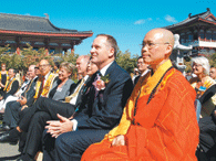紐西蘭總理Mr. John key(右二)蒞臨北島佛光山浴佛節盛典,住持滿信法師(右一)及首位華裔民族事務部長黃徐毓芳在旁,觀賞佛光青年表演活動。人間社記者Ken攝
