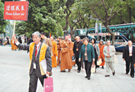 活動到第四天,當天行程是前往宜蘭參觀佛光大學及蘭陽別院,林傳銘雖有點透支體力,還是滿臉笑容,依舊親切地招呼貴賓。每到一目的地,就率先下車舉牌(右圖/人間社記者鄧淑明攝),細心叮嚀行的安全。參訪結束要回到車上前,又高舉識別標幟揮舞,提醒貴賓「不要搭錯車」。