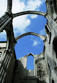 轉了兩趟車終於抵達了,但站立街頭茫茫然不知往哪個方向走,看看前方廣場上的雕塑,決定先往自由大道廣場上走去,行進在波浪型的廣場上令人一陣迷惑,這葡萄牙典型的地板彷彿令人置身海洋中,站在波浪上乘風快意,在不經意中竟然看到了那棟我要去的目標,於是以無屋頂的修道院為標的,一路向陡峭的斜坡前行。
