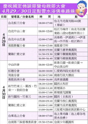 慶祝國定佛誕節暨母親節大會4月29/30日定點雲水浴佛車路線 |2009.04.28 語音朗讀 1101觀看次 字級 大 中 小 慶祝國定佛誕節暨母親節大會4月29/30日定點雲水浴佛車路線 前一篇文章 慶祝國定佛誕節暨母親節大會4月27日定點雲水浴佛車路線 下一篇文章 【慶祝國定佛誕節暨母親節】佛光山浴佛活動 全台展開 熱門新聞 01從粒線體 找到修補身心靈的曙光2025.11.2902【生│活 │美│學】一花一詩 中華花藝的詩情畫意2025.11.3003南非Safari 動物舞台細細觀察2025.11.3004義國友善小鎮 人熊和平共存2025.11.3005尋光2025.12.0406【閃文集】 威尼斯印記2025.12.0207【中醫專欄】 缺能量嗎?是時候補補氣了2025.11.2908三好校園永平高中 深耕品德教育獲表揚2025.11.2909淡水、基隆、汐止21萬戶停水 爆民怨2025.12.0210首例碳封存場址 苗栗居民反彈2025.11.30 訂閱電子報 台北市 天氣預報 台灣一週天氣預報 相關報導 緬懷星雲大師 全球佛教學者暢談人間佛教245校雲端交流 凝聚三好共識推廣生命教育 林聰明獲特殊貢獻獎西方寺瑜伽課 接引民眾結法緣元宵乞龜 390兩大金龜亮相基督城地震10年 佛光山領眾祈願