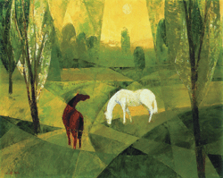 有形似無形的技法,將草地上綠色植物錯綜交置得表現出幽渺未知的意象。兩匹形、色相異的馬,悠然自得徜徉其中。整幅畫面因著自然的鋪陳,而衍生出溫柔寧靜的質感。(1978年 油畫 80x100cm)