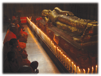 圖說:一群比丘與沙彌,在拘尸那羅的涅槃場虔誠唱誦,場景有如佛陀住世。