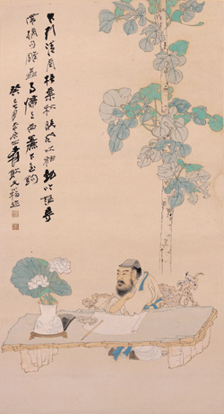 此作為張大千盛年所作精筆人物畫,取法明代畫家陳老蓮拙勁有力的風格,線條用筆精準圓勁,有若屈鐵盤絲,高士眉目五官鬚髮如生,開相古雅,與早年透逸的風格差異頗大。桌上的瓶花、文房器皿、桌椅擺設,以及梧桐樹拙致挺勁的造型,無不高古細緻;通幅以特殊之黃楊綠色調為主,深淺變化有致,設色之脫俗典雅,令人讚嘆。加以題識書法落款之蒼勁多姿與精到合宜,實為畫家精筆人物畫之力作。
