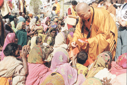 關懷不分種族、不分國界!圖為一九九八年佛光山開山星雲大師至印度菩提伽耶大覺寺前,發放食品、衣物、日物品、救濟金、睡袋、輪椅給當地需要的人。圖/佛光山慈悲基金會提供
