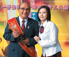 國際佛光會中華總會汐止第二分會督導闕藏村當選全國模範勞工,昨天接受表揚,女兒闕嘉瑩與有榮焉。