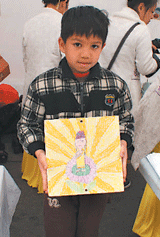 首爾佛光山寺二十六日於燃燈祝祭活動,舉辦「人間畫廊」彩繪佛像活動,圖為小四倪瑋愷與自繪的佛陀合影。