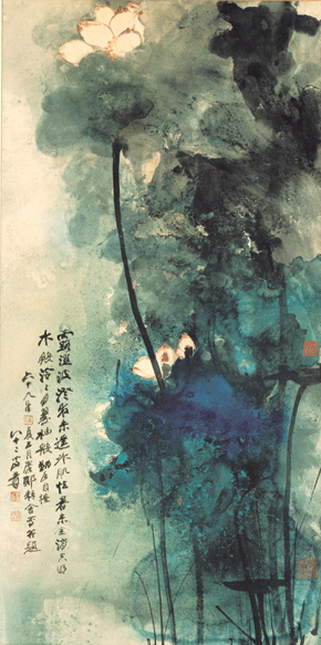 張大千先生自六○年代創潑彩技法,至八○年代可謂得心應手,技巧純熟,已經能廣泛地應用到各類題材。本幅著意表現夏日雨後荷塘的濕冷,畫面潑寫兼施,墨彩相融,當中墨暈流動所造成的特殊肌理,更營造出露濕沁涼、水氣迷濛的氛圍。