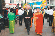 【人間社記者倪世健倫敦報導】為慶祝佛陀聖誕,倫敦佛光山九、十日在倫敦Leicester Square Garden舉行「愛與和諧世界」浴佛活動。九日,在獲女皇勳章MBE、OBE封位的長老Galayaye Piyadassi與Ajahn Khemadhammo、英國國會議員Councillor Harvey Marshall、西敏市多元宗教主席Mr.Jon Dal Din等八千位貴賓的祝福中,倫敦佛光山住持覺如法師與西敏市副市長Councillor Alexander Nicholl點和平燈,揭開序幕。