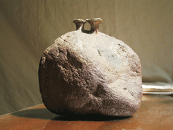 楊元太通常塑燒巨大的作品,像雙口陶瓶這麼小巧、只及一雙掌攤開大的物件,十分稀少。陶土並未上釉,但高燒一千三百度以上,呈現褐紅色。瓶身密布針眼般的氣孔,其上有些許凹陷、裂紋,還有刻意畫的三條線,整體像山崖邊一塊渾成的巨岩。