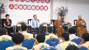 最後一場二○○九年人間佛教閱讀研討會—「菩薩與義工」,十七日在桃園縣大溪寶塔寺舉辦,主題論壇貴賓,有寶塔寺住持慧得法師(右起)、中華總會秘書長覺培法師、檀教師鄭石岩、桃竹苗區協會長朱唐妹。人間社記者涂順龍攝