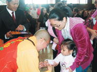 小朋友由父母牽著、抱著,如來寺住持妙多法師、佛光爸爸媽媽代表吳耀宙伉儷帶領,在「最初的喜悅—演奏曲」聲中,走過成佛大道,通過七彩氣球拱門,步入大雄寶殿;隨著妙多法師誦持中葡文的《心經》及葡文譯本〈為兒童祈願文〉。 (人間社記者心主攝)