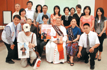天主教樞機主教單國璽(中坐者)與十二位讀者、周大觀文教基金會創辦人周進華(左一)、香港台灣婦女會下屆準會長趙安安(左三坐者),和出版《活出愛》工作人員合影。記者李祖翔攝