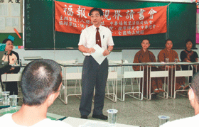 中山大學企管系教授吳欽杉(站立者)至明陽中學,與同學們一起分享人間福報的好文章。