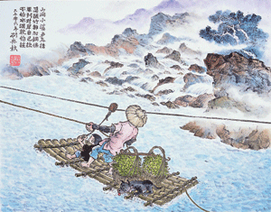 先將一條鋼索固定在兩岸,鋼索上配置一個滑輪,用繩子連接上一艘竹筏,外加一條繩子,就成了最簡便的渡河交通船。村民必須小心翼翼地登上竹筏,然後穩穩地坐在中間,以免一個不平衡就落入水中,然後用手使勁拉繩子,讓竹筏向前行進。