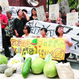 「要西瓜,不要開發!」 圖與文/高堂堯 |2009.06.19 語音朗讀 939觀看次 字級 大 中 小 苗栗灣寶是知名搜索引擎Google Map上唯一標示「百甲重畫地」的優良特定農業區,後龍科技工業園區開發案計畫徵收該區農地建廠,昨天營建署進行建案可行性審查,會後決定擇期再審。灣寶社區農民昨天帶著親手栽種的新鮮蔬果北上,向營建署抗議後龍科工園區開發案。他們表示,灣寶田地最適合發展農業,若闢建科工園區,失去在地特色,也是剝奪居民生存權。圖與文/高堂堯 前一篇文章 陸客遊台 已逾33萬人次 下一篇文章 台灣500大 去年獲利大衰退 熱門新聞 01從粒線體 找到修補身心靈的曙光2025.11.2902【生│活 │美│學】一花一詩 中華花藝的詩情畫意2025.11.3003南非Safari 動物舞台細細觀察2025.11.3004義國友善小鎮 人熊和平共存2025.11.3005尋光2025.12.0406【閃文集】 威尼斯印記2025.12.0207【中醫專欄】 缺能量嗎?是時候補補氣了2025.11.2908三好校園永平高中 深耕品德教育獲表揚2025.11.2909淡水、基隆、汐止21萬戶停水 爆民怨2025.12.0210首例碳封存場址 苗栗居民反彈2025.11.30 訂閱電子報 台北市 天氣預報 台灣一週天氣預報 相關報導 涉詐千餘案 內政部封小紅書1年盧秀燕:第3次政黨輪替 對人民應是好事藍白擋下1.25兆軍購 暫緩列案默克高雄半導體園區落成 鎖定AI晶片秋鬥遊行 高喊反戰求生救台灣海鯤艦5度無錨海測 台船:安全
