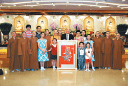 十九日普門寺住持永富法師偕同國際佛光會中華總會秘書長覺培法師、三寶寺住持依照法師及吳伯雄家人等,恭誦《藥師灌頂真言》、祈願文,祈求佛陀加被榮譽總會長吳伯雄闔家擁有健康的身心、和樂的家庭、順利的事業、幸福的人生。永富法師並代表佛光山開山星雲大師贈送一幅中國「壽」字圖,為吳伯雄祝壽。 (人間社記者覺空攝)