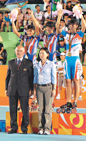 黃郁婷一出場就受到熱情歡呼,她也不負眾望,發揮實力,以二十七秒六七○拿下金牌,我另一好手許巧人以二十七秒六七六獲銀牌,銅牌由南韓林金秀(譯音)二十七秒九六八獲得。