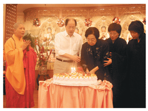 榮譽功德主張姚宏影 85大壽 文/人間社記者覺均 圖/人間社記者妙毅 |2006.04.12 語音朗讀 716觀看次 字級 大 中 小 佛光山榮譽功德主,也是日月光集團創辦人張姚宏影居士(中),昨日在台北道場如來殿慶祝八十五歲大壽,家屬及日月光集團員工同誦持《藥師經》祈福。佛光山宗委會宗委慧寬法師前往祝賀,並以譗母親無私奉獻豃為題與在場近兩百位嘉賓結緣。最後,在主法依培法師(左一)帶領下,長子張虔生(左二)、二媳馮美珍(右二)、女兒張迎申(右)及與會大眾一起唱頌譗無量壽佛豃圓滿結束。會後,壽星張姚宏影居士以壽桃與大眾結緣。 前一篇文章 佛光山僧信禪淨七七 二七圓滿 下一篇文章 佛光義工40--鄭秀筆 結緣奉獻 找回自信 熱門新聞 01【閃文集】火星暗斑之謎2025.12.1602【詩】草螟公2025.12.1803【為人父母】 允許如其所是2025.12.1504【詩】 航夢2025.12.1505東方微笑跨越千年 麥積山石窟現佛館2025.12.1506福建艦航經台海 空拍照首曝光2025.12.1807高雄新航線明啟動 佛光山成亮點2025.12.1708寶塔寺 三代同堂搓湯圓、繪燈籠2025.12.1609佛光山福國寺 獲頒台南市宗教績優團體獎2025.12.1510如何優雅不濺水花?2025.12.16 訂閱電子報 台北市 天氣預報 台灣一週天氣預報 相關報導 緬懷星雲大師 全球佛教學者暢談人間佛教245校雲端交流 凝聚三好共識推廣生命教育 林聰明獲特殊貢獻獎西方寺瑜伽課 接引民眾結法緣元宵乞龜 390兩大金龜亮相基督城地震10年 佛光山領眾祈願