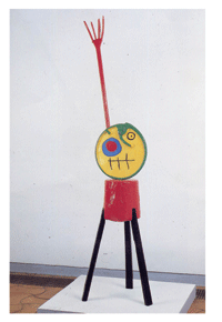米羅的雕塑像孩子遊戲的積木,以一種全然即興而遠離計畫與理性的安排為其創作的迷人特質,他喜歡用一些現成物或廢棄物,用積木堆壘的方法,一件件往上架高,造成不同的物件與物件之間,或者說是廢棄物與廢棄物之間幽默的邂逅與相會,教人看了發出莞爾微笑,並讚嘆那種孩童般無心的調皮與稚拙。
