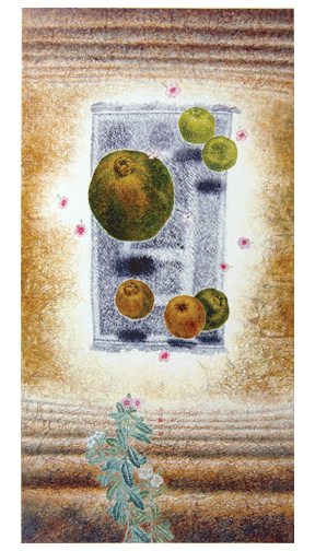 「日日春與六大桔」創作於一九九八年,傳統的中國文化裡,表達象徵吉祥意義之形式,藉植物花果描述豐富想像內涵,作為此幅創作動機。