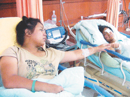 高雄縣那瑪夏鄉孕婦林巧盈(左)昨天在醫院拉著弟弟的手,強忍淚水跟弟弟說:「這個家只剩我們了,我們要堅強的活下去。」