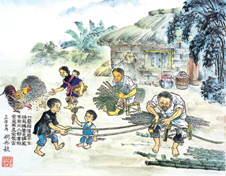 劉興欽老師走過什麼都要自己動手做的時代,他最怕的就是這種竹藝會失傳,於是為這幅民俗畫寫下了這首令人懷念的打油詩:「竹藝相傳幾千年,編籠編簍也編籃。全家大小都會做,家庭用具全包含。」