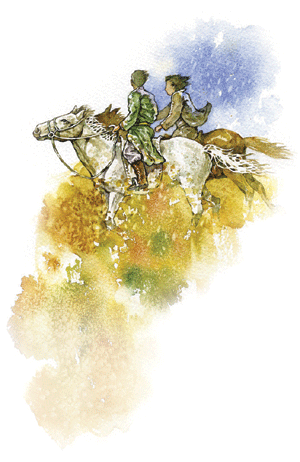 跑了一段很長的草地後,我們來到河邊飲馬,真沒想到草原深處還流淌著這麼清澈的淙淙小河,河邊長滿奶黃色蘆葦,在晌午陽光暉映下,構成一幅美不勝收的油畫,我瞪大眼睛,怕它轉瞬即逝。就在此時,天空傳來了一陣嗚嗚的叫聲,我抬頭一看,十幾隻烏鴉在頭上飛過,心裡頓生幾分不快,牧馬人也望著天空喃喃自語:「恐怕天要下雨了。」飲完馬後,我望著炎炎烈日,那來雨意?心裡責怪牧馬人瞎咋唬,跨上馬,並催促他一道繼續向草原深處挺進。