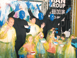 美國紐約的「藍人組」與台北「婦聯聽障文教基金會」小朋友進行一場創意十足的即興演出。包括大型彈弓、籃球、刷子全都出籠,沾上顏料後投擲在畫布上,共同完成一件創意作品,將參與義賣。