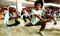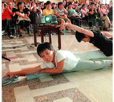 【記者郭士榛台北報導】雲門舞者和一百四十位網路舞迷首次「網聚」,昨天在國家戲劇院大廳,上百位網友、噗友、臉書族,參加由兩廳院、雲門共同主辦的「行草三部曲」PK大賽。大家一起以身體「寫」出e世代書法,挑戰林懷民經典舞作《行草三部曲》。