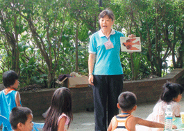 「這是什麼?」「是熊!」故事媽媽張玉麗生動地透過圖畫書讓孩子認識動物,並讓孩子透過畫圖抒發心中情緒,一位原住民小女孩在白紙上畫出向日葵,流露出對未來的希望。