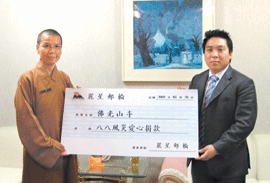 【人間社記者陳秋玉台北報導】麗星郵輪公司主席林國泰的公子林拱輝(見圖右/人間社記者陳秋玉攝)代表公司,昨天前往佛光山台北道場慨捐百萬賑助災民,由國際佛光會中華總會副秘書長妙凡法師代表接受,並讚揚麗星郵輪公司關愛災民的大愛精神。