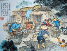 蘿蔔曬了一天,傍晚時收進屋,又有的忙了。收進來的蘿蔔,要在上面灑上一層鹽,然後用力去揉,揉完了,在蘿蔔上壓塊大石頭,讓多餘的水分排出來。第二天早上再將所有揉過鹽巴的蘿蔔拿出去曬,傍晚收進屋中再灑鹽再揉,再壓上大石頭。如此反反覆覆地,直到蘿蔔不再有水分流出為止,蘿蔔乾就算製作完成了。這時蘿蔔變乾了,但是也變香甜柔軟了,那種甘香滋味,真好聞哩!
