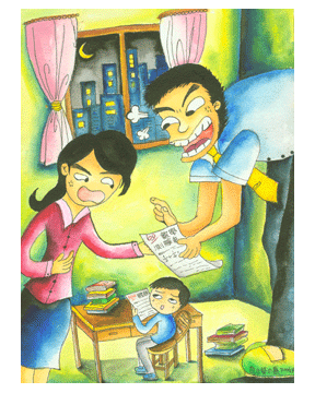 今天補習班發考卷,結果我的數學只考六十分,我覺得自己已經盡力了;可是爸媽說考不到九十分以上就得打。我問過爸媽,為什麼考不好就得被打,他們竟然回答:「該用的方法都用了,打對你才有效。」