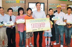 桃園縣長朱立倫(左五)昨天與環保人員,鼓勵民眾回收有害廢棄物,提煉貴金屬。吳佩玲攝