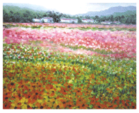 小墾丁渡假村,位於屏東滿州鄉,那林立的休閒木屋,有美國西部牛仔風味,可以騎馬漫步於園區;或坐敞蓬馬車溜達於鄉間,溫馨又浪漫,是山林間養精蓄銳的好地方。在鄉公所近郊,種滿幾甲的菊科植物,一片萬紫千紅的花海,令人嘆為觀止,尤其那柔美嬌艷的波斯菊、瑩潔的花朵,有雪白、淺粉、金黃酘酘更間雜深紅,五彩繽紛、璀璨絢麗;我們徘徊於花叢小徑,和風徐徐,陣陣幽香,大地蘊含著無限生氣、意趣;瞧那花兒婀娜多姿、千嬌百媚,我們樂陶然,不覺神遊太虛酘酘花海裡,燦爛的生命,多盼望不飄落、不凋零。