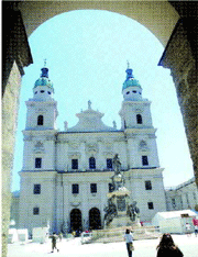 對於薩爾斯堡,我們簡直失望透頂。一群遊客對著街上一張地圖指指點點,每個人都茫茫然。我只好盲人騎瞎馬,四處亂撞。幸好一位當地居民,帶著我們找到了「葛洛肯編鐘」,以及大教堂。