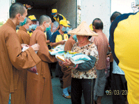 屏東講堂住持妙璋法師偕同佛光會南區輔導法師妙嚴法師、督導長莊月香等幹部,四日到萬丹鄉發放慰問金,四個村共一千一百五十六戶受益,每戶五千慰問金及佛光平安米一袋,讓災民深感來自巴西的溫暖。