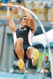 安慶隆昨天在聽奧田徑男子十項運動撐竿跳高項目,跳出四公尺二○。趙文彬攝